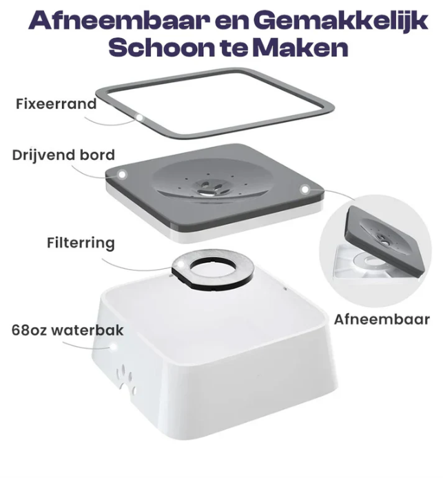 De drinkbak bestaat uit losse onderdelen die je makkelijk uit elkaar haalt. Even spoelen en klaar!