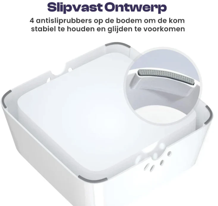 De drinkbak heeft een drijvende schijf die alleen een kleine hoeveelheid water doorlaat. Zo voorkomt het spatten, morsen én natte snuiten.